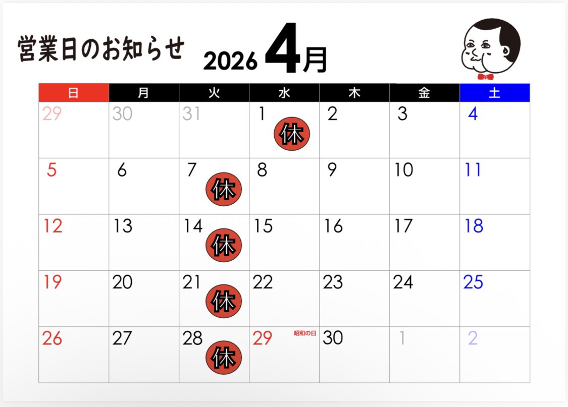 毎週火曜日が定休日となります(4/1、4/7、4/14、4/21、4/28)。