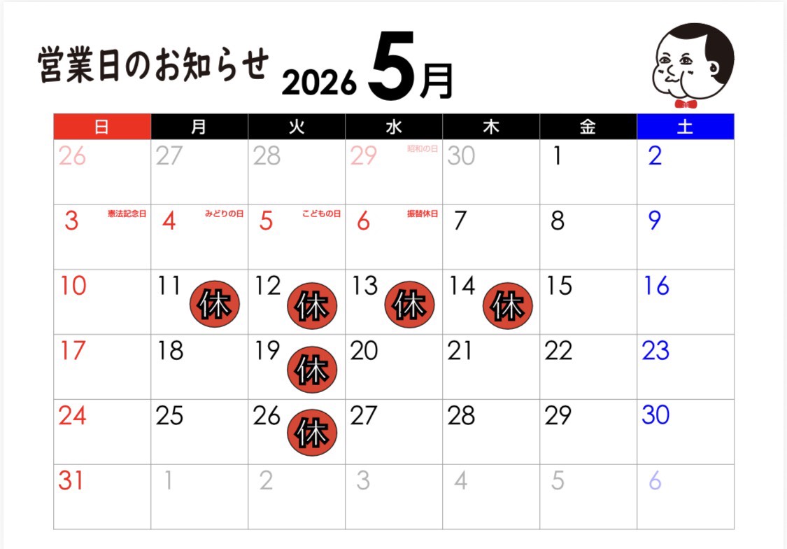 なお、ゴールデンウィーク期間(5/3〜5/6)は休まず営業いたします。
